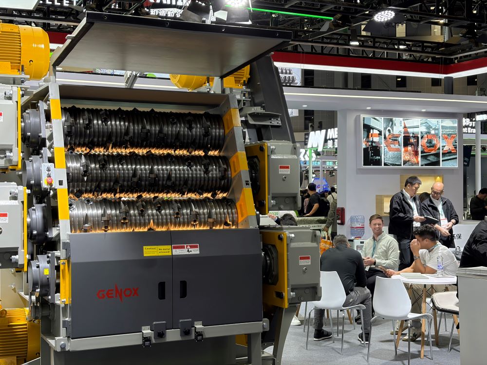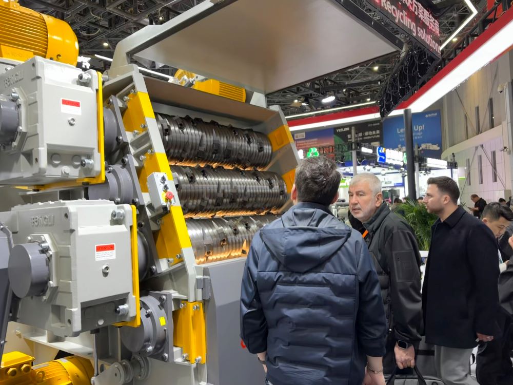 面对混杂、大型坚硬物料的回收场景,隽诺环保展出了超大扭矩剪切设备X系列双轴撕碎机。该系列设备搭载高强度合金热处理制成的刀具与低速大扭矩传动系统,可从容处理含金属、橡胶、硬质塑料等难破碎成捆物料或者高强度物料,保证高破碎效率。先进的密封系统防止物料从箱体漏出,保证轴承使用寿命;箱体的模块化设计大大降低了设备主要部件维护的成本。X系列撕碎机凭借其稳定可靠的破碎表现和广泛的物料适应性,已成为废旧家电拆解、汽车破碎料处理、工业固废处理等领域的核心装备。